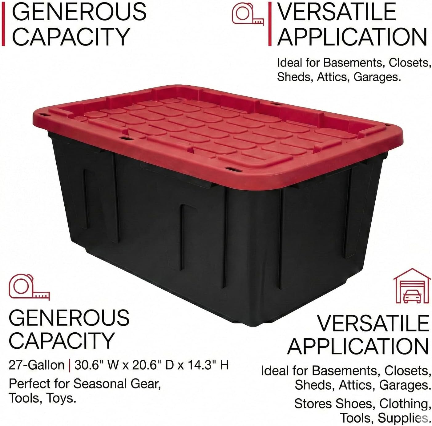 | Recommended Uses For Product | Automotive Parts Storage, Basement Storage, Camping Gear Storage, Emergency Preparedness Kits, Garage Organization, Holiday Decoration Storage, Moving And Relocation, Sports Equipment Storage, Survival Supplies Storage, Tool Storage, Workshop Storage |