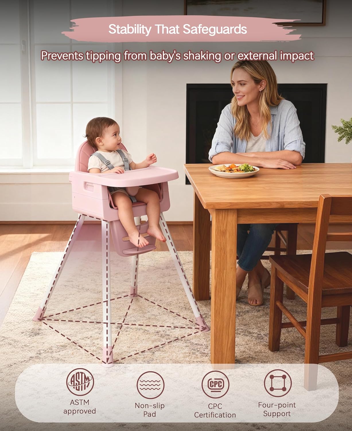 A safe, ergonomic high chair designed for toddlers! Sturdy frame ensures stability, easy-to-clean seat simplifies mealtime messes, and adjustable height grows with your little one. Ideal for comfortable, secure feeding moments.