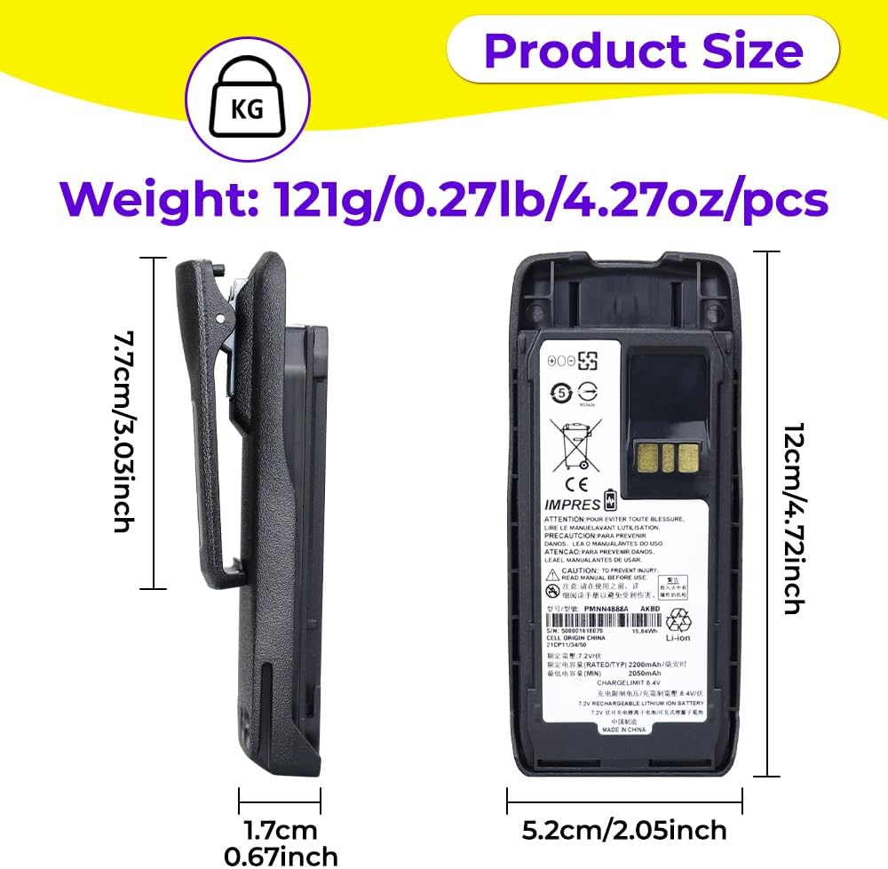 Description:Model:PMNN4888A Capacity: 2200mAhType: Li-ion BatteryVoltage: 7.2VWeight: 138g/0.304lb/4.87oz/pcsWatt Hours: 15.84WhCompatible with R5 Two Way Radios Compatible with R5 Two Way Radios: PMNN4878 PMNN4878A PMNN4888 PMNN4888A Note: 1. Before you order it,please double-check if the item can work for your radio,please check the compatible list2. All our batteris was not full charged,please charged it before usedPackage:1x Battery 1xBelt clip