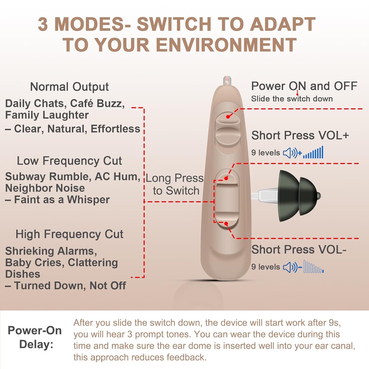 | Recommended Uses For Product | 1. Fully charge the battery before using the device for the first time. 2. Turn off the power before assembling the device. 3. If the hearing aid produces feedback or whistling, please check if the ear dome fits snugly inside the ear canal or replace it with a different size and ensure tight connection among the inbuilt wire tube and the ear dome.4. If you hear noise, allow time for adaptation and try switching modes. 5. It may take 20-30 days to get used to the sound. |
