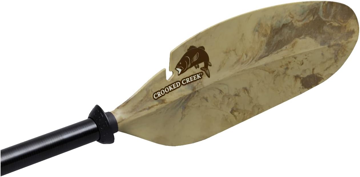 The kayak-style paddle allows one person to easily paddle a Beavertail Stealth 1200, Stealth 2000, Phantom, or Final Attack sneaker. Polyfiber composite dihedral blade for touring performance. Dock-hook blade cutout to aid in edge pulling and reinforced blade tip for pushing. The weedless line/lure retrieval slot also helps easily remove stuck lures from logs and debris. Fiberglass shaft with laser-etched measuring scale. Angle adjustment with three push-button feather settings; convenient two-piece design for storage. Camo blades with a black shaft.