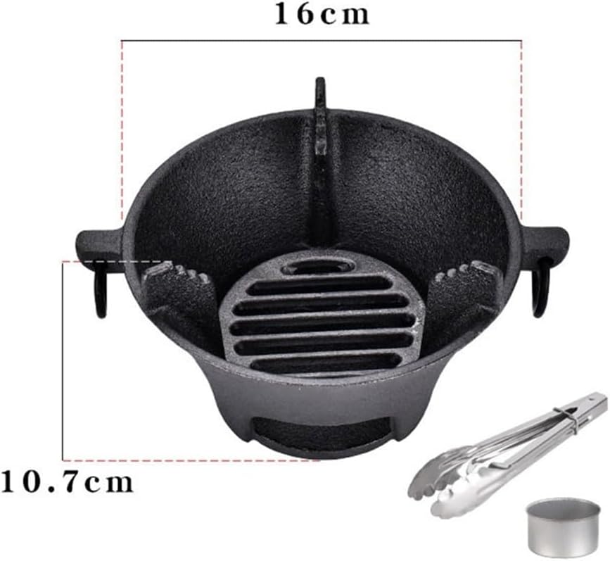 Features:* Integrated casting molding: The charcoal stove is made of cast iron, durability and stability. It is seamlessly molded for a sleek and sturdy construction.* Thicken the bottom of the pan: The bottom of the stove is designed to be thicker, allowing for better heat retention and distribution. This results in more even cooking and prevents hot spots.* Uniform heat conduction, not easy to paste pot: The stove provides uniform heat conduction, allowing your food to cook evenly. With its efficient design, it minimizes the risk of food sticking to the pan, making it easier to clean.* Portable and for versatile: This charcoal stove is compact and lightweight, making it perfect for outdoor use such as camping or picnics. It can be used as a Korean cooktop or a Japanese barbecue grill, giving you flexibility in your cooking options.* Easy to use and maintain: The stove is user-friendly and easy to operate. It is designed for hassle-free setup and does not require any complicated assembly. Cleaning is also a breeze due to its non-stick properties.Specifications:*Part Name:carbon furnace*Material:Cast iron*Size:25.5cm*25.5cm*11.5cm*Color:BlackPackage Content:1* carbon furnace1* clip2* cup