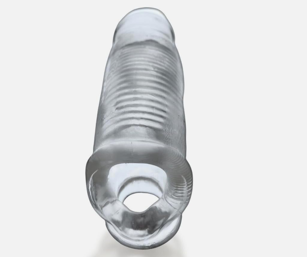The Clear Enhancer and Extension Sheath is expertly crafted to provide a significant increase in both girth and length. Made from thick flexTPR material, this sheath offers 3-5 times more girth and an additional 5-7 inches in length. Its substantial size makes it ideal for those seeking an intense and satisfying experience. With a secure cocksling base, this sheath stays in place whether the penis is flaccid or erect. The inner shaft is adorned with heavy ridges and nubs, delivering incredible sensations during sexual activity. This versatile sheath is designed not only for the pleasure of your partner but also offers an exceptional stroking experience for solo play.