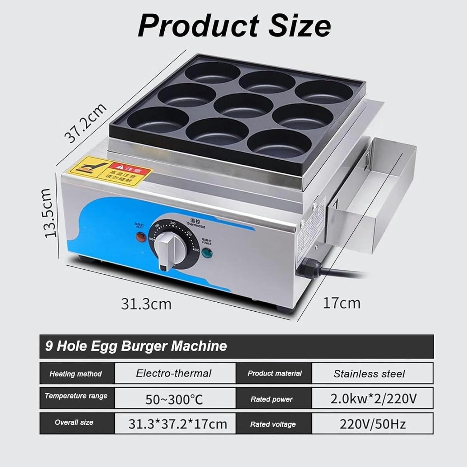 The omelette maker non-stick can even be used for desserts, mini cheesecakes custard, all within minutes. Giving you perfect, sous vide egg bites at home for whole family.Omelette Pans Fried Egg PanOmelette PanCommercial Electric Heating Meat Hamburger Maker GriddleRed Bean Cake MachineEgg Bite MakerCommercial Electric Heating Red Bean Cake MachineFeaturesMake the perfect omelettes every time. Can also be used for fried eggs, scrambled eggs or cakesCooking plates cook evenly for tasty, thick omelettes.Non-stick cooking plates, no more messing around with frying pans, butter or oilThe easy route to the perfect omelette! Makes plain or filled omelettes at onceAlso doubles up as a fried/ scrambled egg makerSpecification:Volts: 220V/50HzPower: 2000WCapacity: 9pcs/timeTemperature:50-300 Egg castle diameter: 8CMSize: 31.3X37.2X13.5CMPacking Weight: 5kg9 Holes Egg Mini Pancake Frying Pan, Commercial Electric Heating Cake Maker Griddle, Omelette Pans