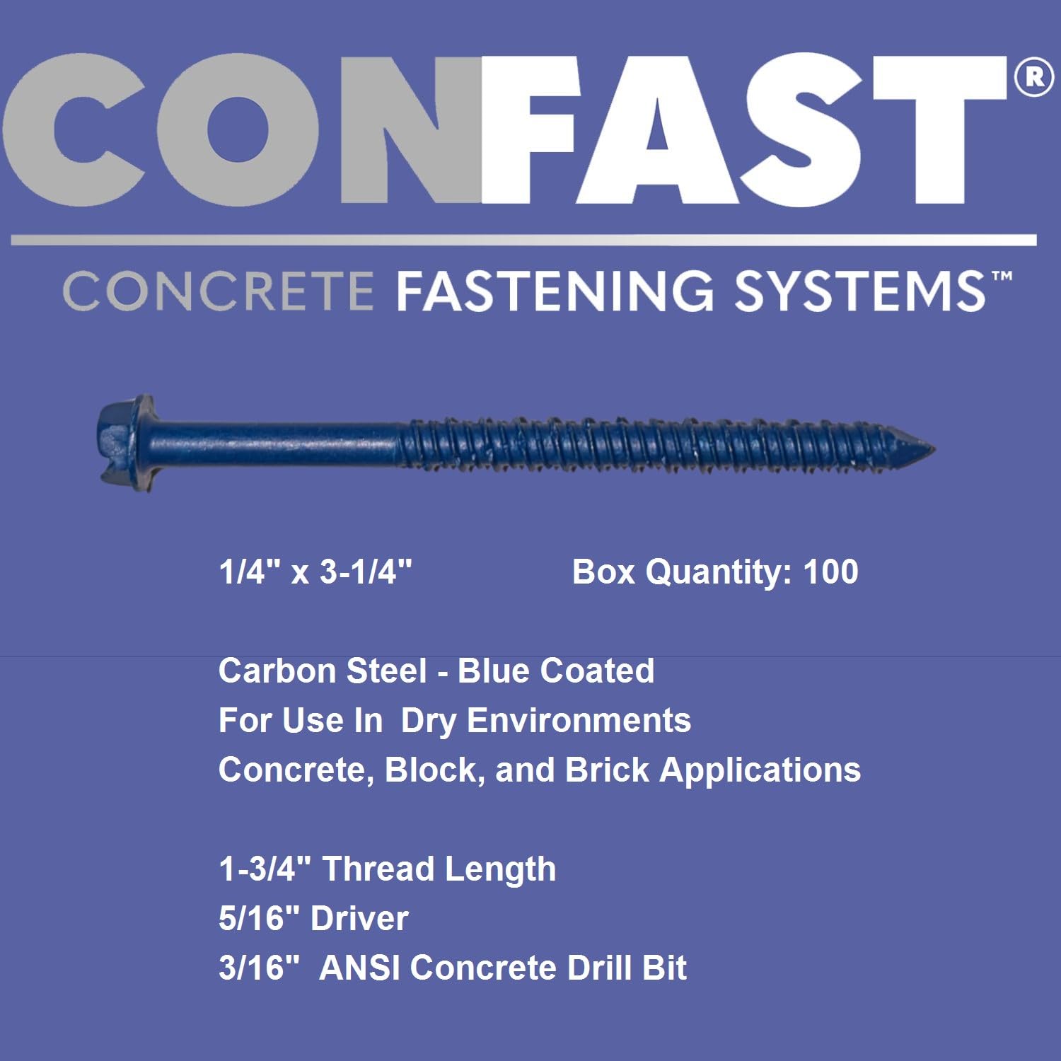 ApplicationsThe anchor is made from Carbon Steel, and is Blue. This anchor is designed for use in Concrete, Block, and Brick.EnvironmentThe anchor is designed for use in a Dry environment.Head Style The anchor is a Hex Washer head and is designed to allow the head to sit on top of the surface of the item being attached.Hole Diameter/Bit DiameterThe anchor requires a 3/16" hole to be drilled in the base material (Concrete, Block, and Brick). The hole should be drilled with carbide tipped bit that meets ANSI standards and used in a hammer drill.Driver RequiredA 5/16" nut driver is required for driving the anchor into the base material.Diameter of Anchor The diameter of the anchor is 1/4".Length Anchor The length of the anchor is 3-1/4"Thread LengthThe length of the threads on the anchor is 1-3/4" in length.Minimum EmbedmentThe minimum anchor embedment into the concrete is 1". Therefore, the anchor must be installed so that a minimum of 1" of the anchor is embedded into the concrete.Maximum Fixture ThicknessThe maximum fixture thickness or the maximum thickness of the material being fastened for a anchor is 1-3/4" to 2-1/4". This will ensure that the minimum embedment of 1" will be met.Fixture Hole DiameterThe hole in the fixture or material being fastened must be larger than the designated diameter of the anchor. The 1/4" diameter anchor requires the hole in the fixture to be 5/16".Spacing between AnchorsEach anchor must be spaced a minimum distance of 4" from each other when measured center to center.Edge DistanceIt is very important not to install the anchor any closer than 3" from an unsupported edge of the concrete.