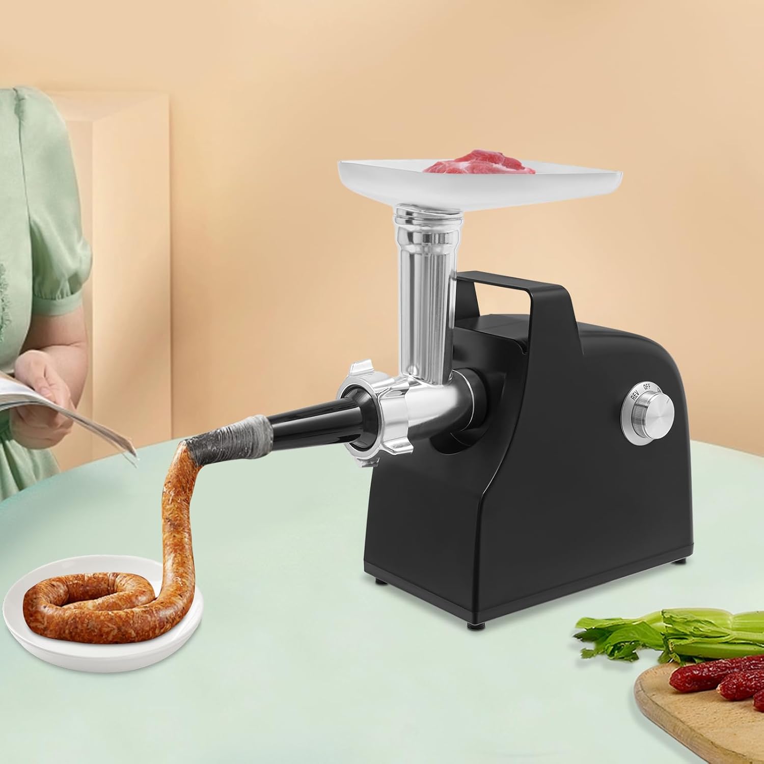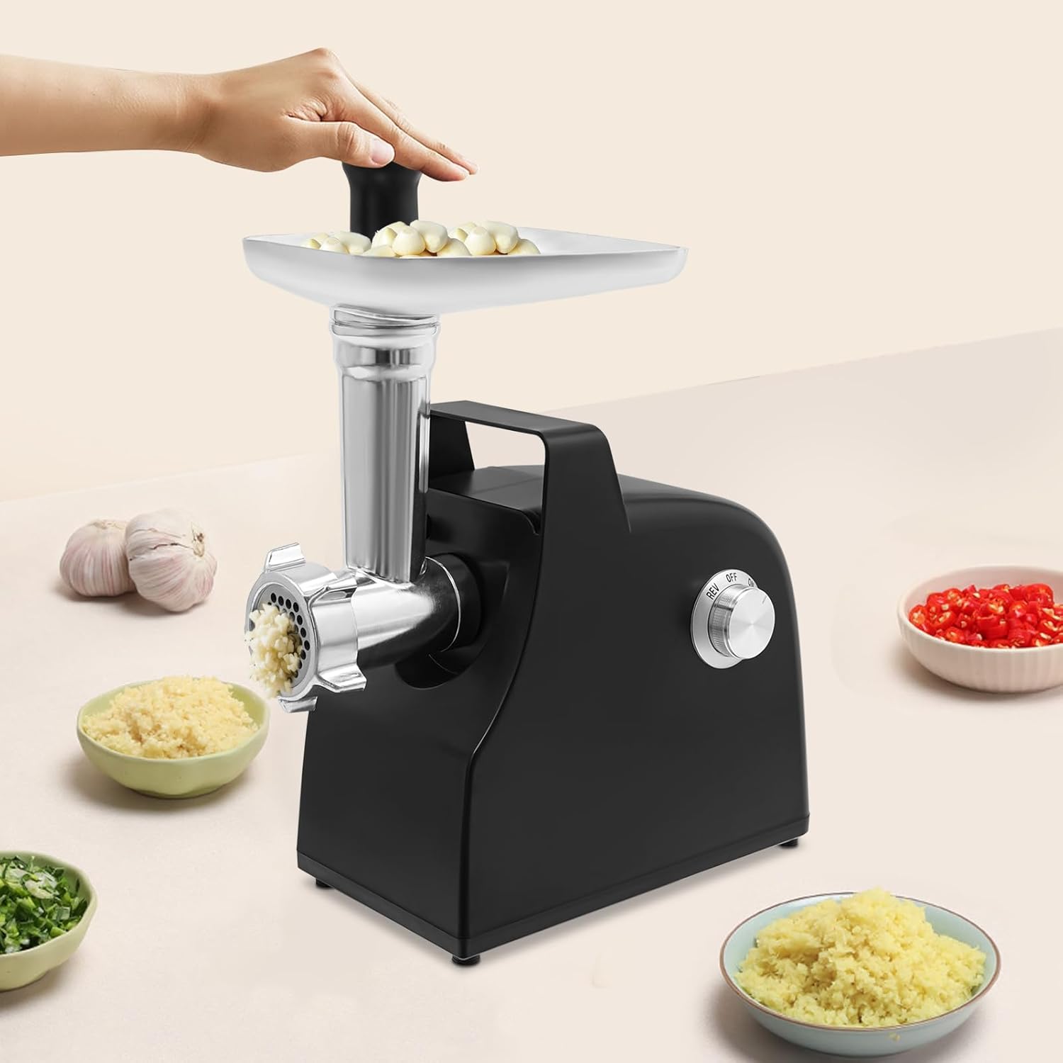 It can be used in homes, hotels, hot pot restaurants, barbecue restaurants, large stalls, Western restaurants, and other places. It can be used to mince beef, pork, etc., make meatballs, tomato/strawberry/blueberry sauce, and stuff sausages.Specification:Color: Silver and BlackMaterial: ABS and IronMounting Type: TabletopAssembly Required: YesPower Source: Corded ElectricPlug Type: US StandardMotor Type: Copper-clad Aluminum MotorRated Power: 500WPeak Power: 1000WSpeed: 220RPMVoltage: 110V, 50HzGrinding Efficiency: 1.5kg/3.3lbs/minProduct Size: 33.5*15*33.5cm/13.19*5.91*13.19 inPackage Size: 32.3*30.3*24.5cm/12.72*11.93*9.65in Gross Weight: 3.6kg/7.94 lbsNet Weight: 3.42kg/7.54 lbsPackage Included:1* Electric Tomato Sauce Maker Machine3* Cutting Plates1* English ManualOther Accessories for UseNotes:1.Please note that this product does not contain any foods.2.Please note that the product is removable and washable, but cannot be placed in the dishwasher and must be washed with water below 104°F.