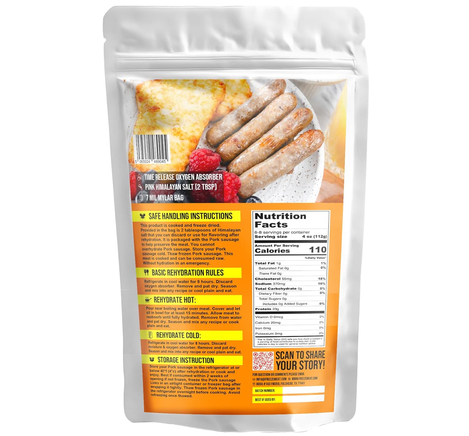 Prepare for any adventure or emergency situation with this freeze-dried Pork Sausage links from a trusted American brand. With a remarkable 30-year shelf life, these tender chicken tenderloins offer a convenient and long-lasting protein source for camping trips, outdoor excursions, or emergency food storage. The package contains 32 Pork Sausage links weighing 7 ounces (198 grams), and is refrigeration and MRNA-free. Simply rehydrate using the provided instructions, and enjoy a delicious, high-quality meal. Ideal for preppers, campers, and anyone seeking a reliable food supply. Store in a cool, dry place for maximum longevity.