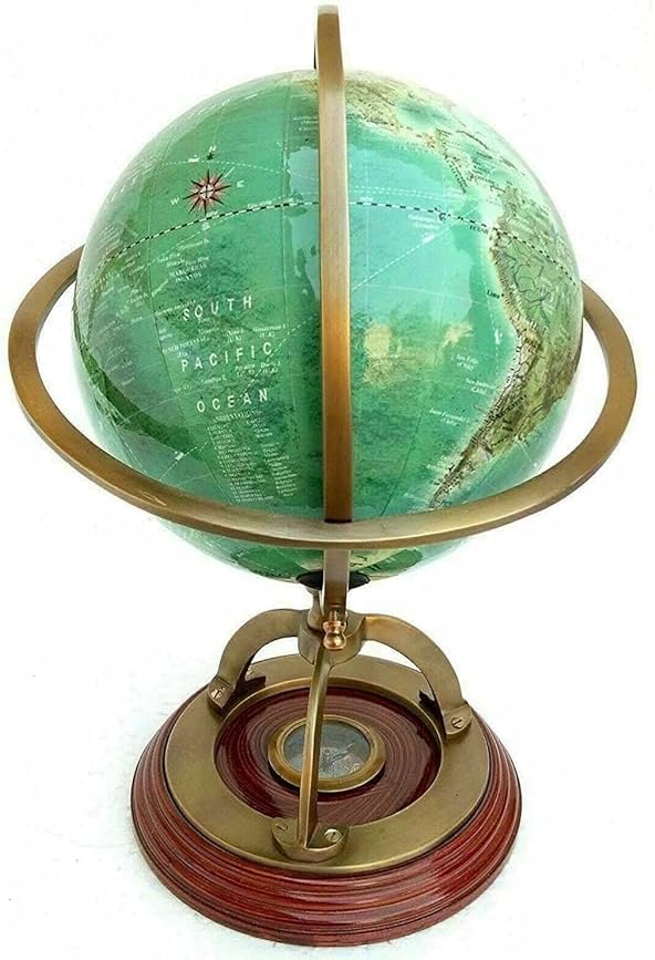 this beautifully crafted 14-inch antique brass world globe, complete with a built-in compass at the base. Ideal for any office, school, or home decor, this globe brings both elegance and functionality to your tabletop