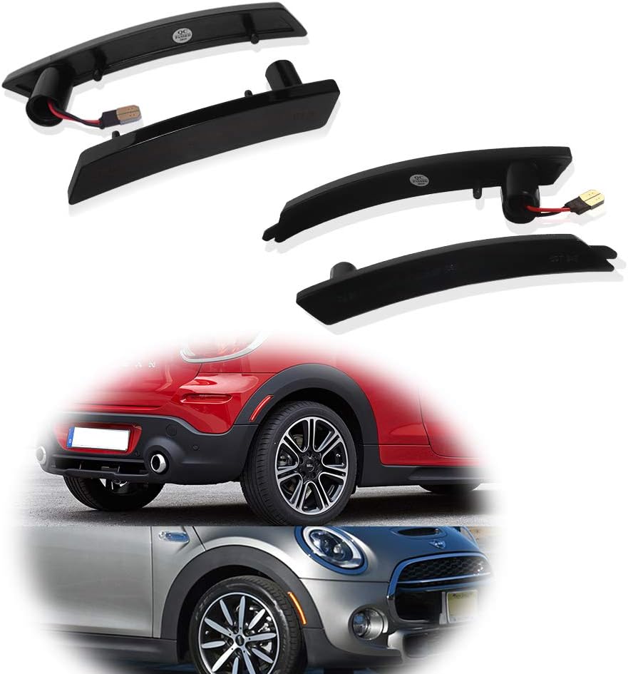 Feature: ► Smoked lens ► Exact fit and direct replacement ► 4-piece set,Driver and passenger side (2 amber front, 2 red rear) dark/black smoke cover lens LED bulb side marker lamps for front and back Fit for the following MINI Cooper models: ✔️2008-2014 R55 Clubman ✔️2007-2013 R56 Hatch ✔️2009-2015 R57 Convertible ✔️2012-2015 R58 Coupe ✔️2012-2015 R59 Roadster ✔️2011-2015 R60 Countryman ✔️2013-2015 R61 Paceman NOTE: Please note this side marker set is made to fit on the MINI Cooper's wheel arches and NOT on the side fenders.
