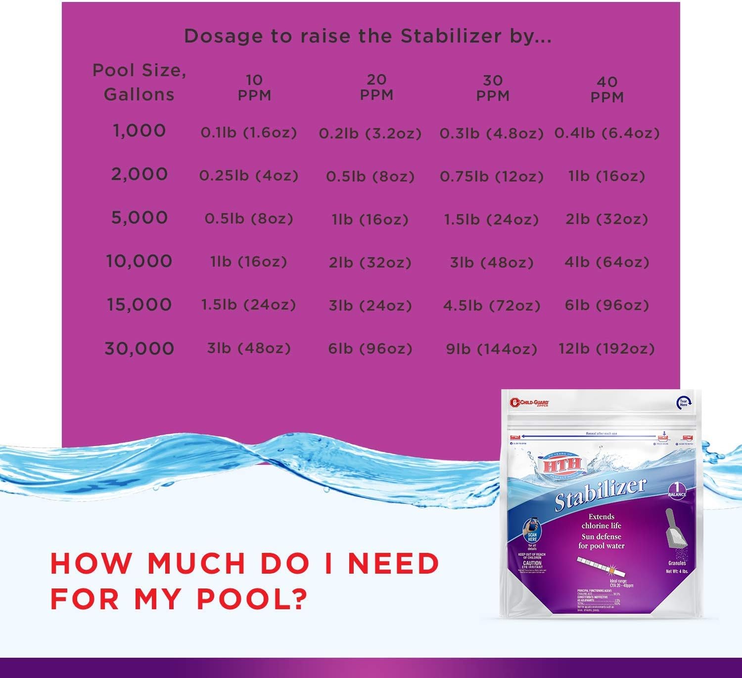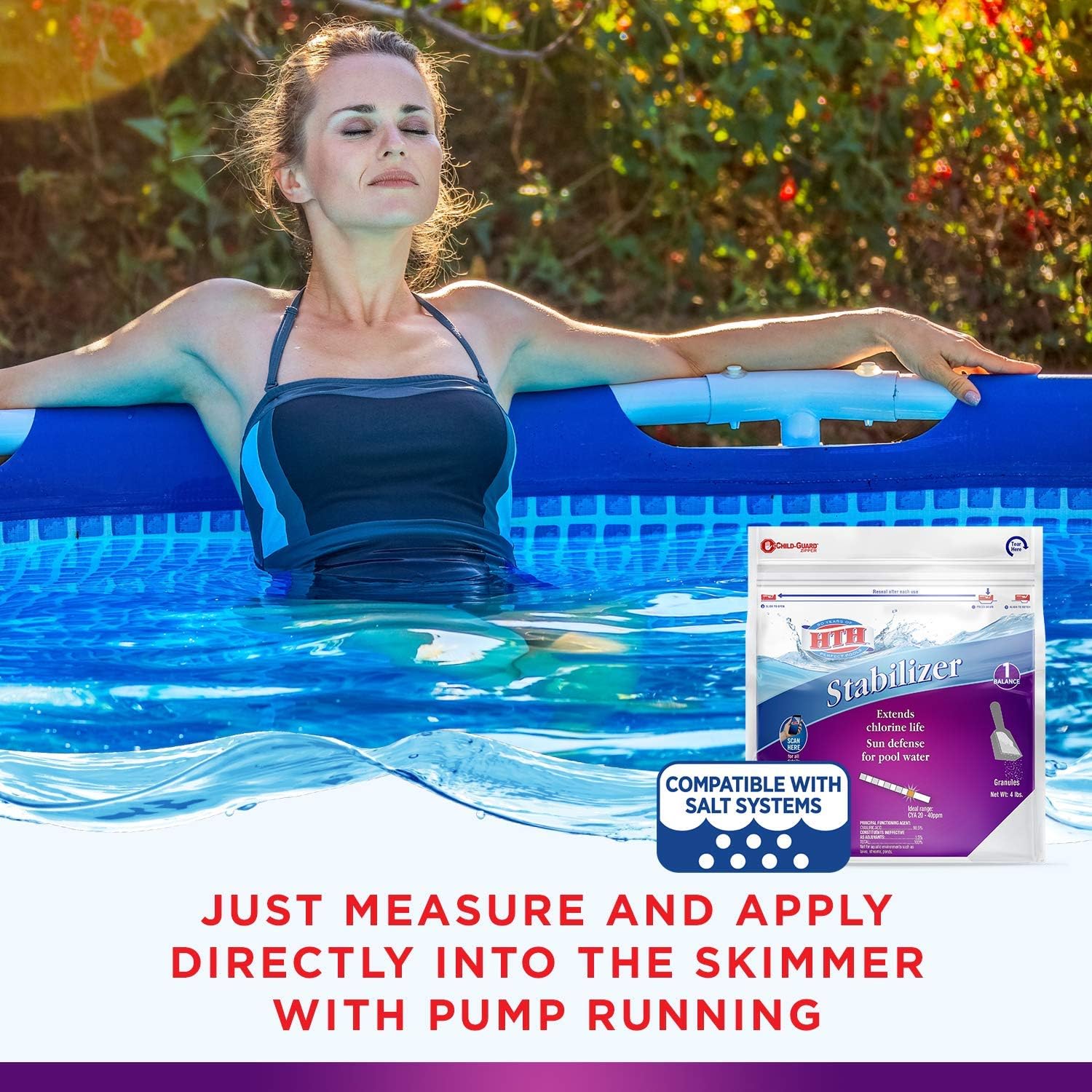 The HTH Stabilizer helps protect and extend the life of chlorine in your swimming pool. If you’re using an unstable chlorinator, adding stabilizer separately can help slow down the effects of direct sunlight on the chlorine levels in your pool. HTH Stabilizer can be added to the skimmer to help your free available chlorine levels stay between 1 and 4 ppm for healthy swimming. This pool care chemical is great for all pool types including vinyl-lined pools and saltwater pools. About the Brand: HTH was developed with the consumer in mind, offering products that are both economical and powerful enough for the toughest jobs. Within HTH’s wide selection of products, we offer everything you need for your pool, from deposit control formulas to non-chlorine shock treatments, powerful surface cleaners, clarifiers, and more. If you like using HTH, check out some of the other similar brands from our parent company, Sigura. With brands like Applied Biochemists, Leisure Time, GLB, Spa Selections, and PooLife, Sigura has a long heritage and more than a century of experience in developing innovative water treatment solutions for use in pools, lakes, ponds, hot tubs, and more. At Sigura, we have an unparalleled passion, pride, and commitment to delivering superior water treatments that improve the environment and enhance the security, health, and safety of the global communities we serve. With our track record of innovation and simple, intuitive solutions that anticipate needs, Sigura customers feel more secure as they enjoy their pools, spas, ponds, and lakes.