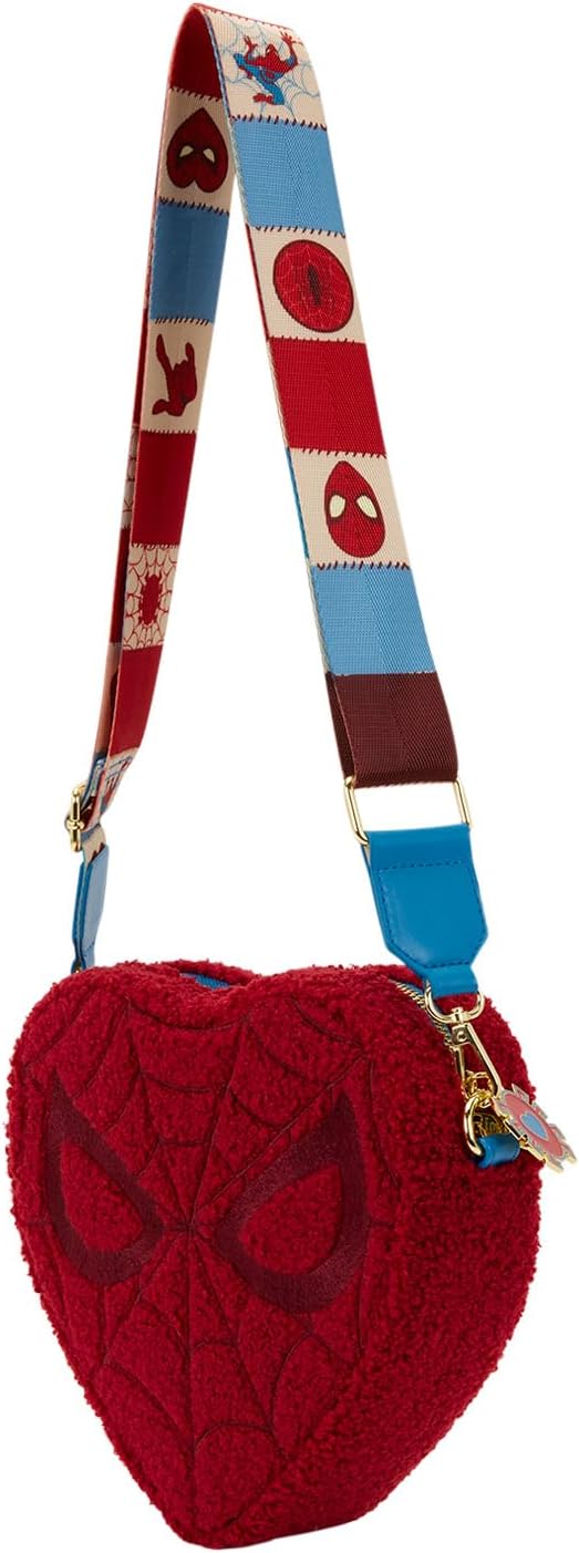 We're all heart eyes over this crossbody! This crossbody bag is in the shape of a heart and features Spider-Man's mask. It's covered in sherpa material. Along the strap, you'll find various symbols of Spider-Man in squares that look stitched together. This is a super sweet accessory that's perfect to show off your favorite super hero!