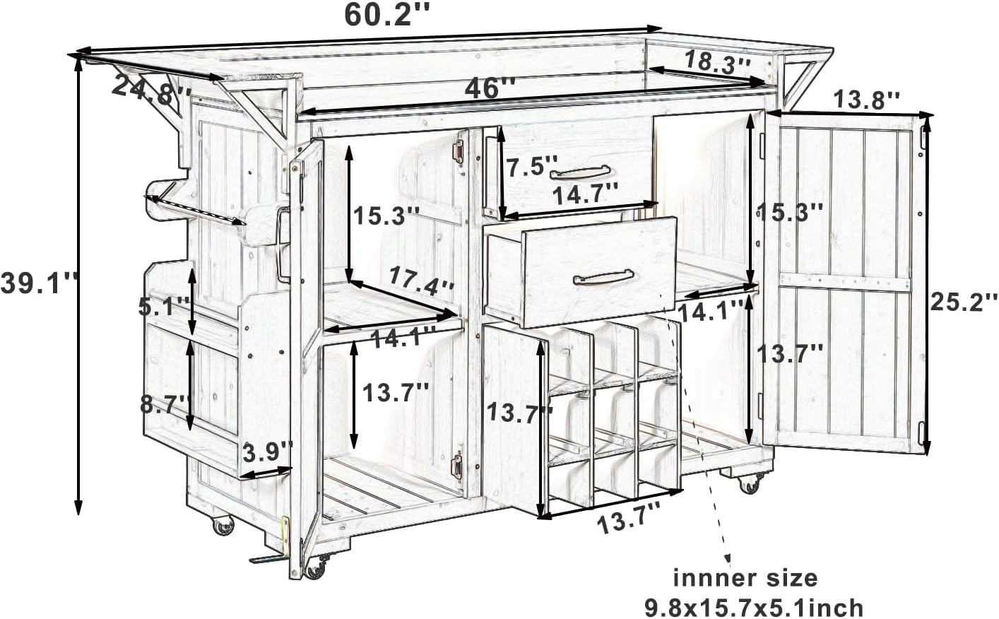 Crafted for durability, functionality, and style, this outdoor kitchen cart is designed to elevate your backyard cooking and entertaining. 🔹 Durable & Stylish Design Solid fir wood frame + stainless steel top for lasting strength and weather resistance. Retro long handles and slatted door panels add classic charm to your patio or garden. 🔹 Spacious Prep & Storage Wide bar countertop with cut-out area offers ample space for food prep and serving (110 lbs capacity). Includes 2 drawers, 2 lower cabinets with adjustable shelves, and a removable 9-bottle wine rack. Built-in gas passage for easy propane tank setup – perfect for grilling. 🔹 Thoughtful Functional Features Integrated bottle opener, towel rack, paper holder, and 5 side hooks for grilling tools. 2-tier side spice rack keeps seasonings organized and within reach. 🔹 Easy Mobility & Secure Setup 4×360° lockable rubber wheels for smooth movement. Anti-tipping ground nails provide stability when wheels are removed. 🔹 Ready for Entertainment Available in 3 attractive colors to match your outdoor decor. Assembly video included + magnetic stoppers for smooth operation. Ideal for BBQ parties, family gatherings, and outdoor cooking. 📏 Dimensions & Notice Overall: 60.2″(L) × 24.8″(W) × 39.1″(H) Tabletop: 46″(L) × 18.3″(W) Note: Wood knots are natural characteristics and not grounds for return.