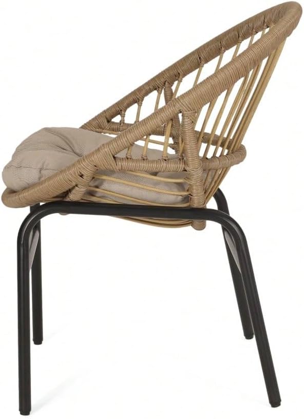 BOHO: For a carefree, unconventional yet sleek look for your patio space, our chair set brings a chic boho touch to your decor by combining a beautifully textured wicker wrap design and gracefully curved backrests that provide incredible structure for stability POLYETHYLENE RATTAN: Featuring a long-lasting woven finish, this style is not only incredibly durable but also provides a versatile appearance. The intricate details of this material allow this piece to blend seamlessly with your outdoor decor WATER-RESISTANT CUSHIONS: Our cushions are covered with a non-porous material that makes cleaning any spill a breeze. Please note that these cushions are water-resistant and not waterproof. Please cover when not in use and do not submerge in water METAL FRAME: Constructed of powder-coated iron, the frame of this chair is made to be incredibly durable, ensuring that this piece will hold up under heavy use. Please note, this is only weather-resistant and it is suggested that this is covered or stored indoors when it rains DIMENSIONS: Choose an accessory that is the perfect size for you and your furniture. Each dining chair is 23.75" W x 25.75" D x 32.75" H. You will love how much your space can transform with the simple addition of these charming dining chairs Product details Complement your patio dining area with seating of streamlined style and sophisticated caliber. This set of dining chairs brings together a stunning wicker wrap design with smooth metal frames to create a sleek and comfortable space for your home. With sturdy basket frames, curved backrest, and beautifully textured design, these chairs will have no problem blending into your outdoor decor with their boho style and incredible durability. This chair set is finished with tufted water-resistant cushions for effortless relaxation throughout the summer season Description With sturdy basket frames, curved backrests, and beautifully textured design, these chairs will have no problem blending into your outdoor decor with their boho style and incredible durability Metal Frame Constructed of powder-coated iron, the frame of this chair is made to be incredibly durable, ensuring that this piece will hold up under heavy use Polyethylene Rattan Featuring a long-lasting woven finish, this style is not only incredibly durable but also provides a versatile appearance. The intricate details of this material allow this piece to blend seamlessly with your outdoor decor Water-Resistant Cushion Our cushions are covered with a non-porous material that makes cleaning any spill a breeze. Please note that these cushions are water-resistant and not waterproof. Please do not submerge in water Warm Tip: Even though it is weather resistant it is still recommended that you cover this piece or place it indoors during inclement weather to optimize its lifespan. Product information Color Light Brown + Beige Product Dimensions 25.75"D x 23.75"W x 32.75"H Pattern Solid Country of Origin China Maximum Weight Recommendation 400 Pounds