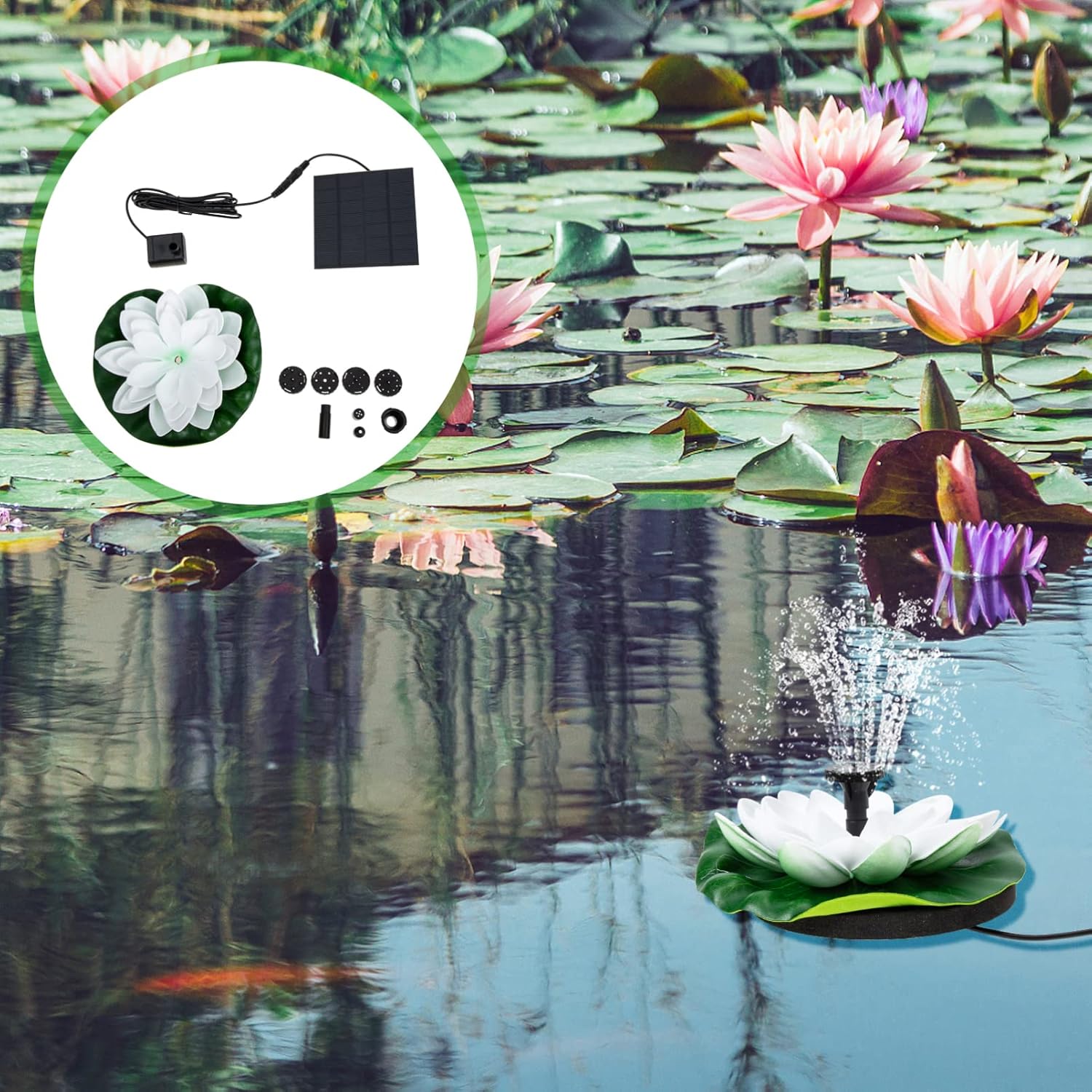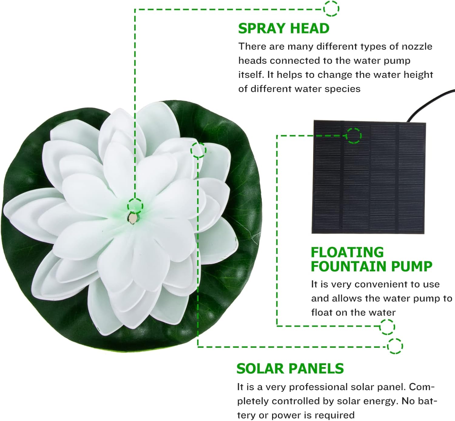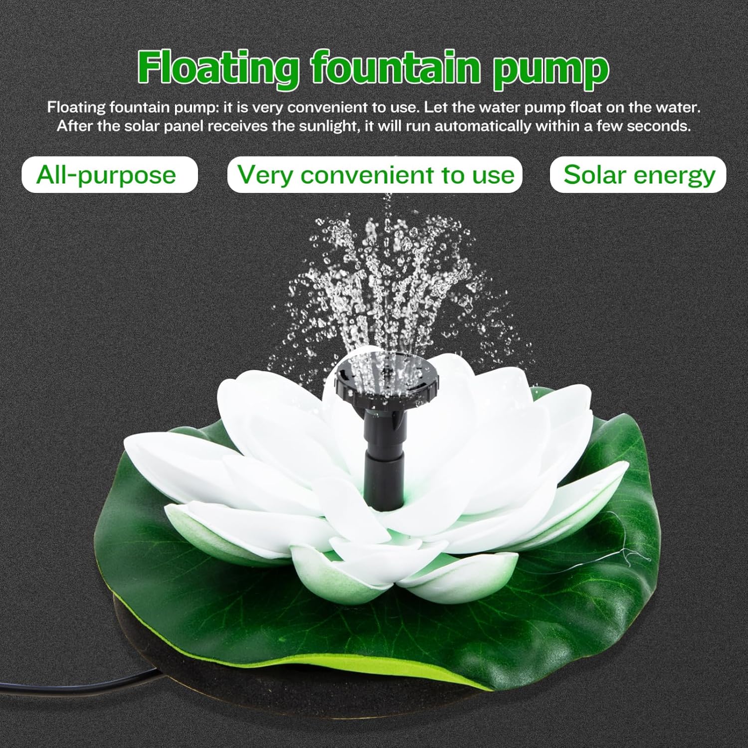 Package List 1 x set of Solar fountain Features - Size: About 18.00X18.00X5.00cm/7.07X7.07X1.97inch Landscape Solar Fountain. Maximum flow: 180L/H Solar-powered Lotus Fountain Pump noise: <45DB Solar Water Fountain. - Pump specifications: Outdoor Pond Fountain voltage: 7V Outdoor Fountain. Water spray height: 30--60cm, the height of the water spray will be different if different nozzles are connected. When the solar panel receives sufficient sunlight, the water pump will start 3 seconds Outdoor Landscape Decor. - Solar panel specifications: Decorative Fountain Pump power: 1.2W Solar Powered Fountain. Working : 150MA Lotus Solar Fountain. - Application: pond, garden landscape, water pool and more, it's easy to use Fishpond Solar Fountain. Working voltage: DC 7V Solar Fountain Decor. - Product performance: Pool Solar Fountain The head: 100CM Floating Solar Water Pump. - Color: White Pond Solar Fountain. - Material: ABS Floating Solar Fountain. Pump life:> Garden Pond Fountain. Material: monocrystalline silicon, PET laminated Floating Lotus Fountain. - This solar fountain decoration makes your garden look so fun Garden Solar Fountain.Goods InformationSolar Floating Fountain Are you looking for an and solar fountain? Are you in search of a sturdy, trustworthy solar fountain that can decorate your pond? If your answer is yes, please look further! Our solar energy fountain must meet your needs.Outdoor Solar Fountain It is one of for you