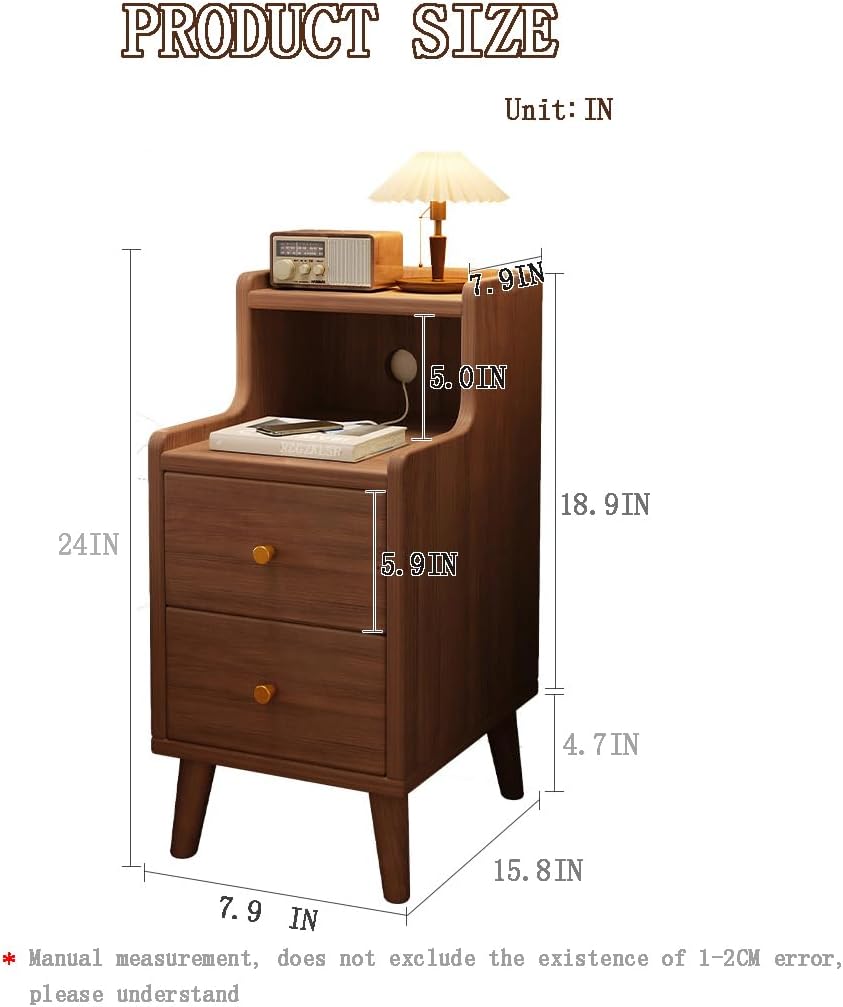 Upgrade your bedroom with the RZGZKLSH 11.8IN Solid Wood Small Nightstand in Walnut. Designed for narrow spaces, this compact nightstand combines functionality and style, making it the perfect addition to any modern bedroom. Crafted from premium solid walnut wood, it offers durability and a sleek, mid-century modern aesthetic. With two spacious drawers, you can easily organize your bedside essentials, while the discreet cable hole ensures your devices stay charged without cluttering your space. Measuring just 11.8IN in length and 15.8IN in width, this nightstand is ideal for small rooms or apartments. Easy to assemble and built to last, this walnut nightstand is a versatile and stylish choice for your home.