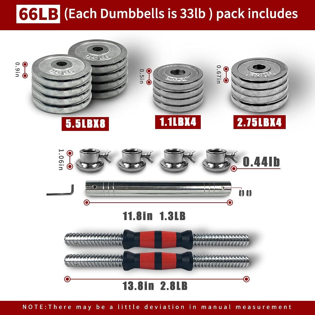 20KG Adjustable Dumbbells 30KG Fitness Weights Set for Men and Women Home Gym Office Barbell Sets 50KG 44LB sets contains: 5.5lbX4 tablets,2.8lbX4 tablets,1.1lbX4 tablets,Dumbbell rod X2,Nut bolt X4,Color plastic gift box X1 66LB sets contains: 5.5lbX8 tablets,2.8lbX4 tablets,1.1lbX4 tablets.Dumbbell rod X2,Nut bolt X4,Color plastic gift box X1 110LB sets contains: 11lbX4 tablets,5.5lbX4 tablets,2.8lbX6 tablets,1.1lbX6 tablets,Dumbbell rod X2,Solid dumbbell handlesX2,Handle connectorX1,Nut bolt X6,Color plastic gift box X1 About Shipping: All states in the continental U.S: 3-8 Biz Days to Arrive. Warm tips: Dumbbell weight is equal to dumbbell piece + dumbbell rod + nut + connecting Rod,all together weight. The actually weight maybe a little different from the description because of different measurement method.