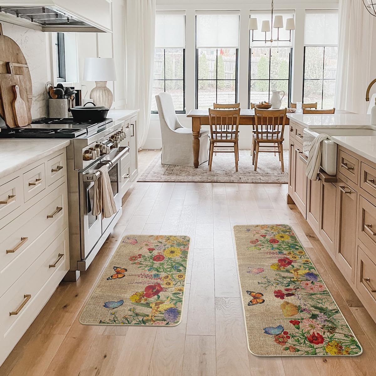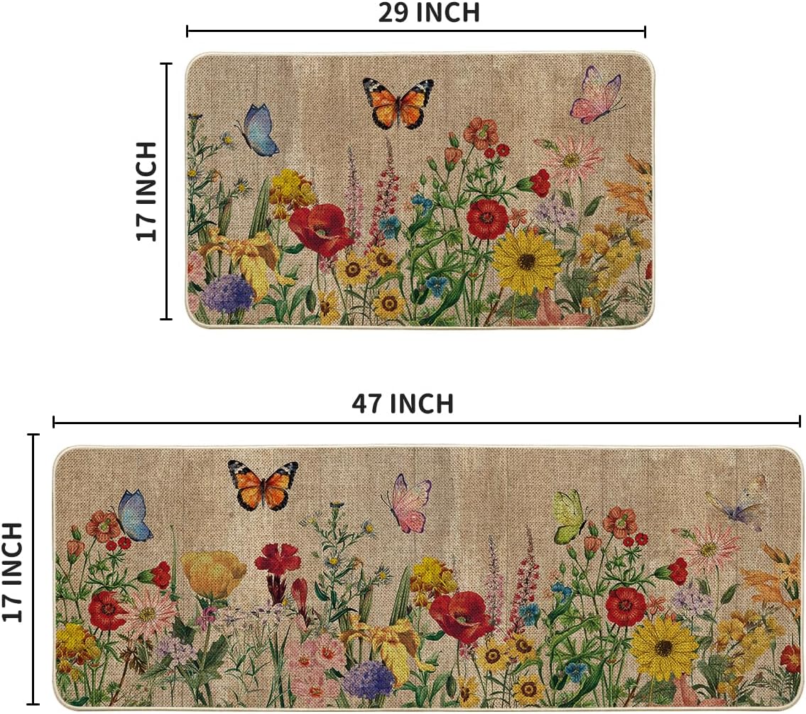 Artoid Mode Wood Flowers Butterfly Spring Kitchen Mats Set of 2, Seasonal Home Decor Leaves Low-Profile Kitchen Rugs for Floor - 17x29 and 17x47 Inch